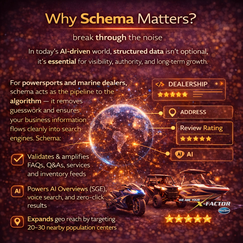 For powersports and marine dealers, schema acts as the pipeline to the algorithm — it removes guesswork and ensures your business information flows cleanly into search engines. Schema: